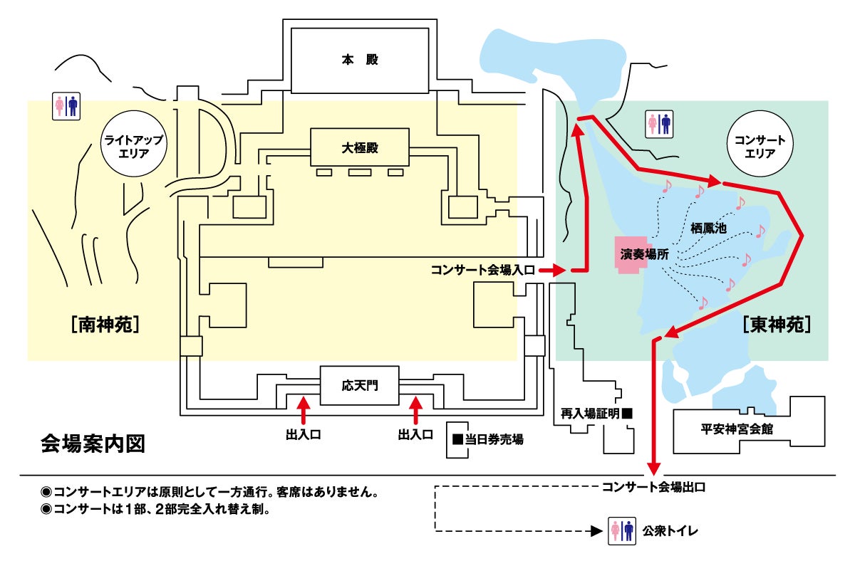 東神苑と南神苑の紅しだれ桜のライトアップと、東神苑貴賓館をステージに演奏される癒やしの音楽をお楽しみいただけます。会場には客席を設けず、ライトアップされた神苑を散策しながら、東神苑・栖鳳池のほとりで、音楽に耳を傾けていただくコンサートです。チケットは、東神苑(コンサート)・南神苑(桜のライトアップ)両方をご鑑賞いただける「コンサート付入場券」、南神苑(桜のライトアップ)のみご鑑賞いただける「入場券」があります。コンサートは入替制によりゆっくりとお楽しみいただきます。