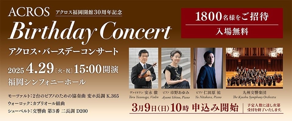 アクロス福岡開館30周年記念 無料招待企画【申込開始】2025年3月9日(日)10:00~先着順