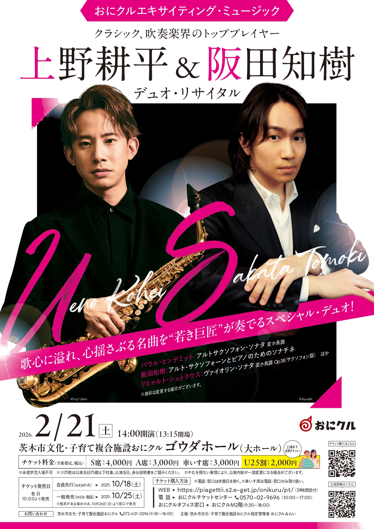 クラシックと吹奏楽を両軸に活躍し、人気・実力を兼ね備えたサクソフォン奏者 上野耕平と、作曲家としての顔を持つ実力派ピアニスト 阪田知樹のデュオ・リサイタル!