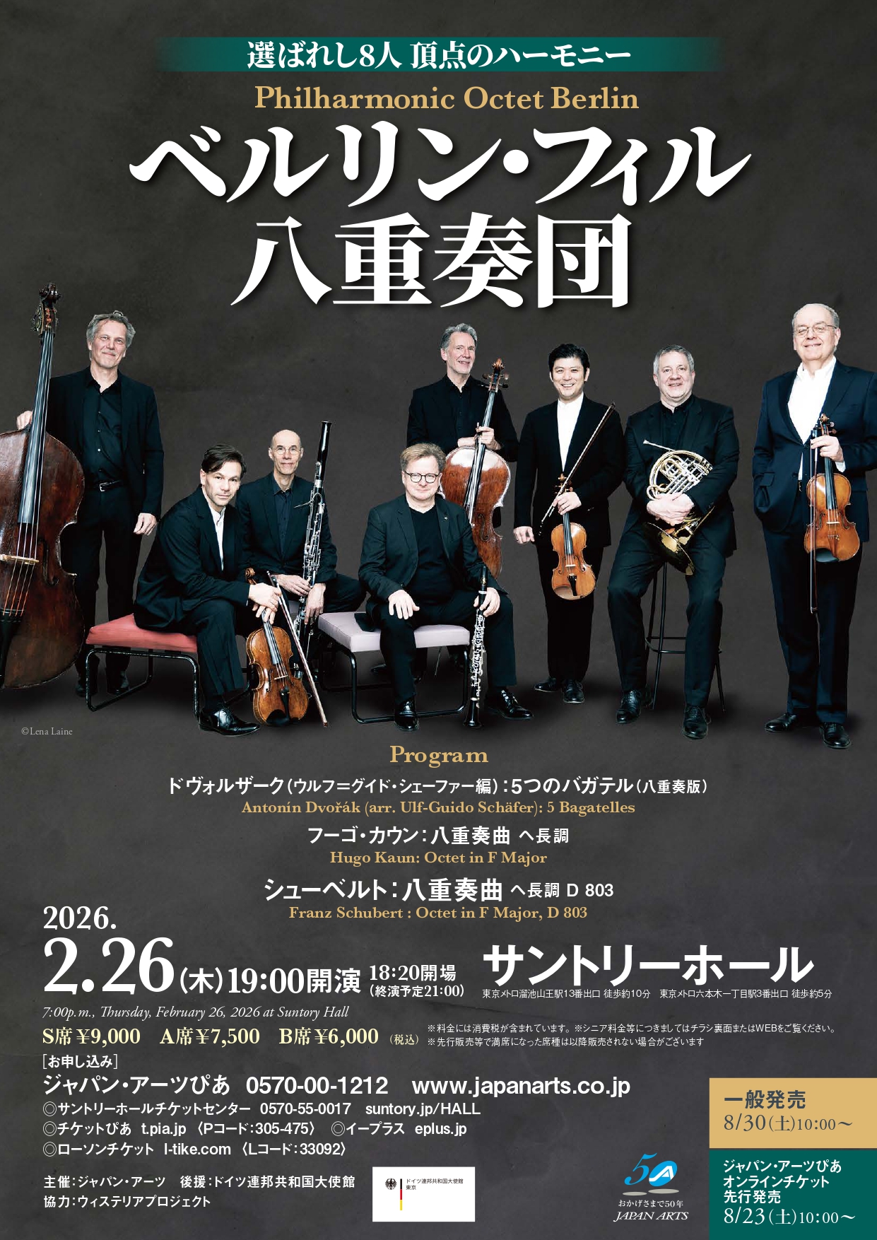 ●2026年2月21日(土) 枚方市総合文化芸術センター(関西医大 大ホール) お問い合わせ/枚方市総合文化芸術センター TEL:072-845-4910 ●2026年2月22日(日) りゅーとぴあ 新潟市民芸術文化会館 お問い合わせ/BSNイベントダイヤル TEL:025-247-0900 ●2026年2月23日(月・祝) 兵庫県立芸術文化センター KOBELCO大ホール お問い合わせ/兵庫県立芸術文化センター チケットオフィス TEL:0798-68-0255 ●2026年1月31日(土) 住友生命いずみホール お問い合わせ/ABCチケットインフォメーション TEL:06-6453-6000 ●2026年2月28日(土) 周南市文化会館 ★7名の特別編成にて演奏 お問い合わせ/周南市文化会館 TEL:0834-22-8787 ●2026年3月1日(日) ミューザ川崎シンフォニーホール ★7名の特別編成にて演奏 お問い合わせ/神奈川芸術協会 TEL:045-453-5080 |