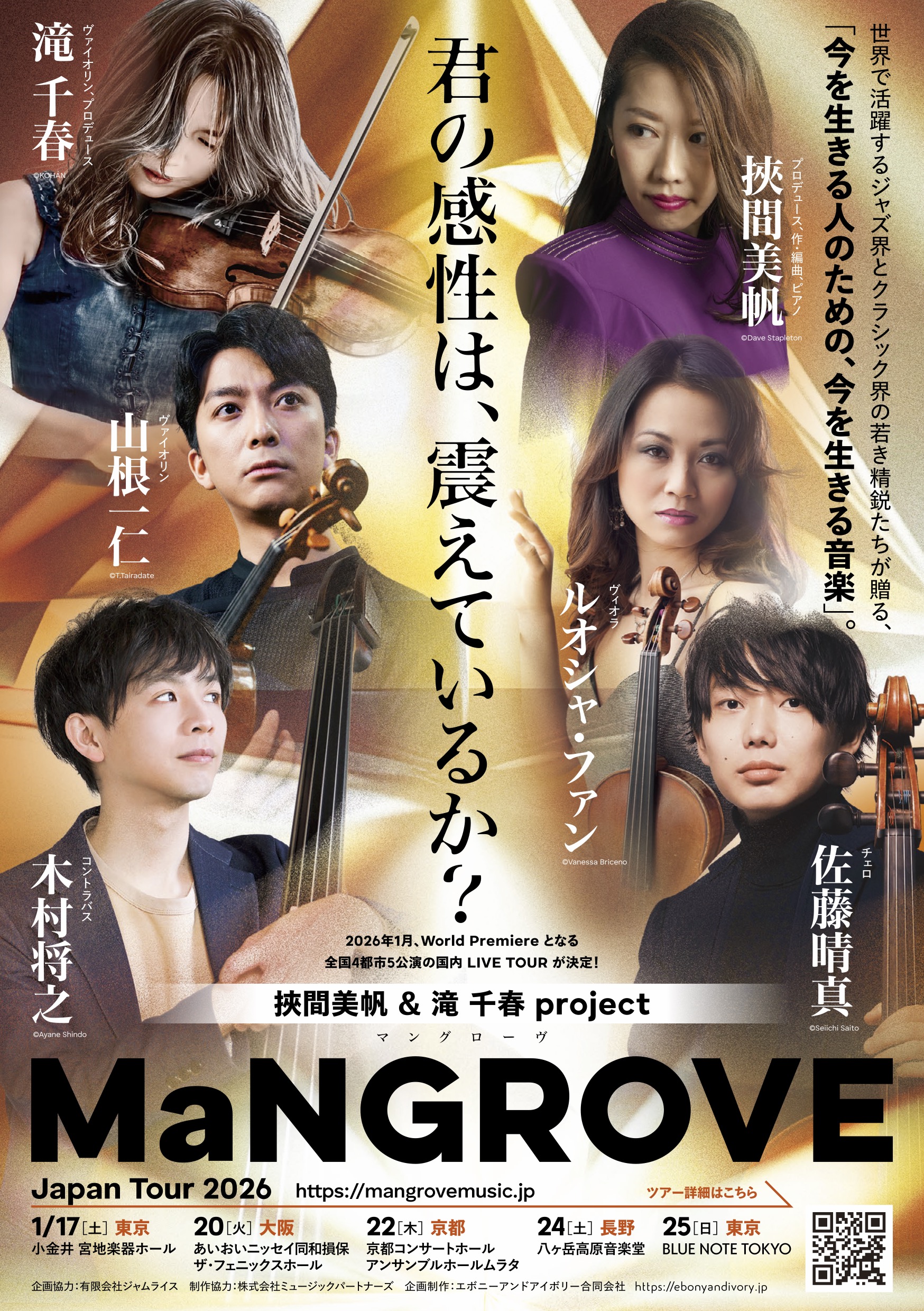 <2026年1月17日 東京・小金井 宮地楽器ホール ほか> 2012年にジャズ作曲家としてメジャーデビューを果たし、2016年にアメリカのDownBeat誌「未来を担う25人のジャズアーティスト」に、2019年にNewsweek日本版「世界が尊敬する日本人100」に選出され、日本を代表する作・編曲家、指揮者、ジャズピアニストとして世界を股にかけて活躍している狭間美帆と、ユーディ・メニューイン国際コンクール第1位など数々の国際コンクールに入賞し、ソリストとして世界各国の主要オーケストラと共演するとともに、コンサートミストレスとしても活躍する滝千春。ジャズ界とクラシック界を担うふたりがタッグを組み、新たなプロジェクトを立ち上げた。「今を生きる人のための、今を生きる音楽」というコンセプトを掲げた新プロジェクトの名は、《MaNGROVE》。巷にあふれる「ジャズとクラシックのコラボレーション」とは一線を画す、「いま」を見据えつつ未来を切り拓くプロジェクトの、ワールド・プレミアとなるジャパン・ツアーが、2026年1月に開催される。