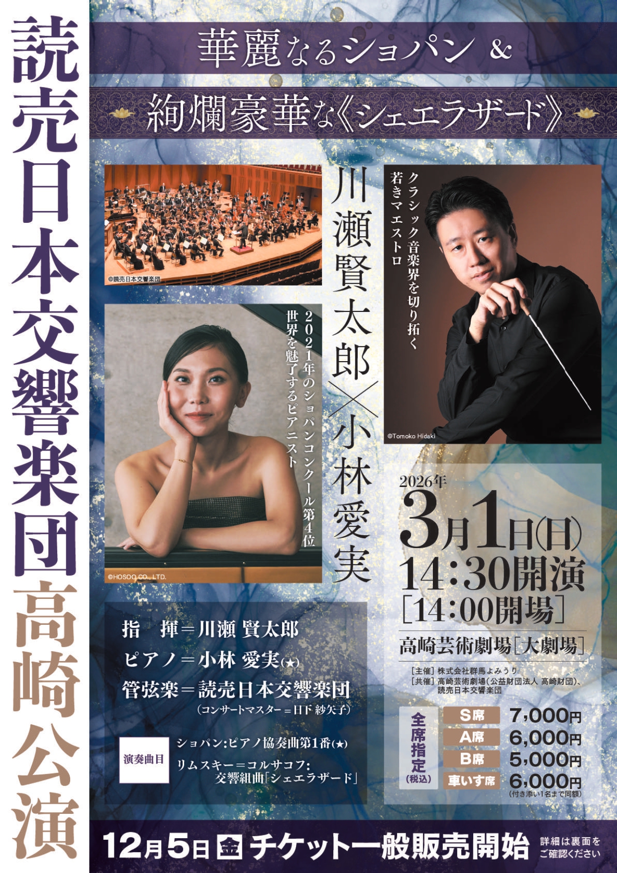 | 公演名 | 読売日本交響楽団 高崎公演 川瀬賢太郎×小林愛実 華麗なるショパン&絢爛豪華な《シェエラザード》 |
