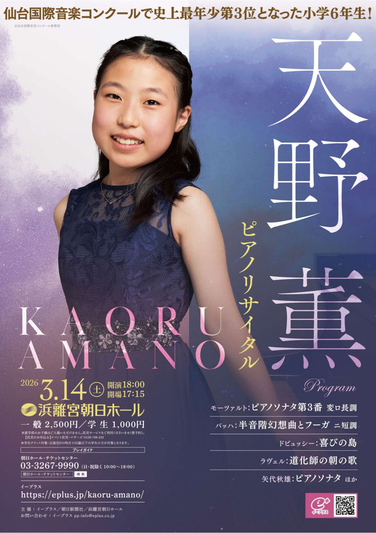 彼女の名は、天野薫。2013年生まれの小学6年生だ。2023年、9歳でデビューリサイタルを開催して以降、第48回ピティナ・ピアノコンペティション Pre特級銅賞、第12回ヨーロッパ国際ピアノコンクール in Japanグランプリ、そして仙台国際音楽コンクールで史上最年少となる第3位・聴衆賞と、数多くのコンクールで入賞を果たしてきた。2026/2027シーズンには、東京フィル、新日本フィル、名古屋フィルとの共演も予定されており、いまもっとも波に乗るピアニストだ。