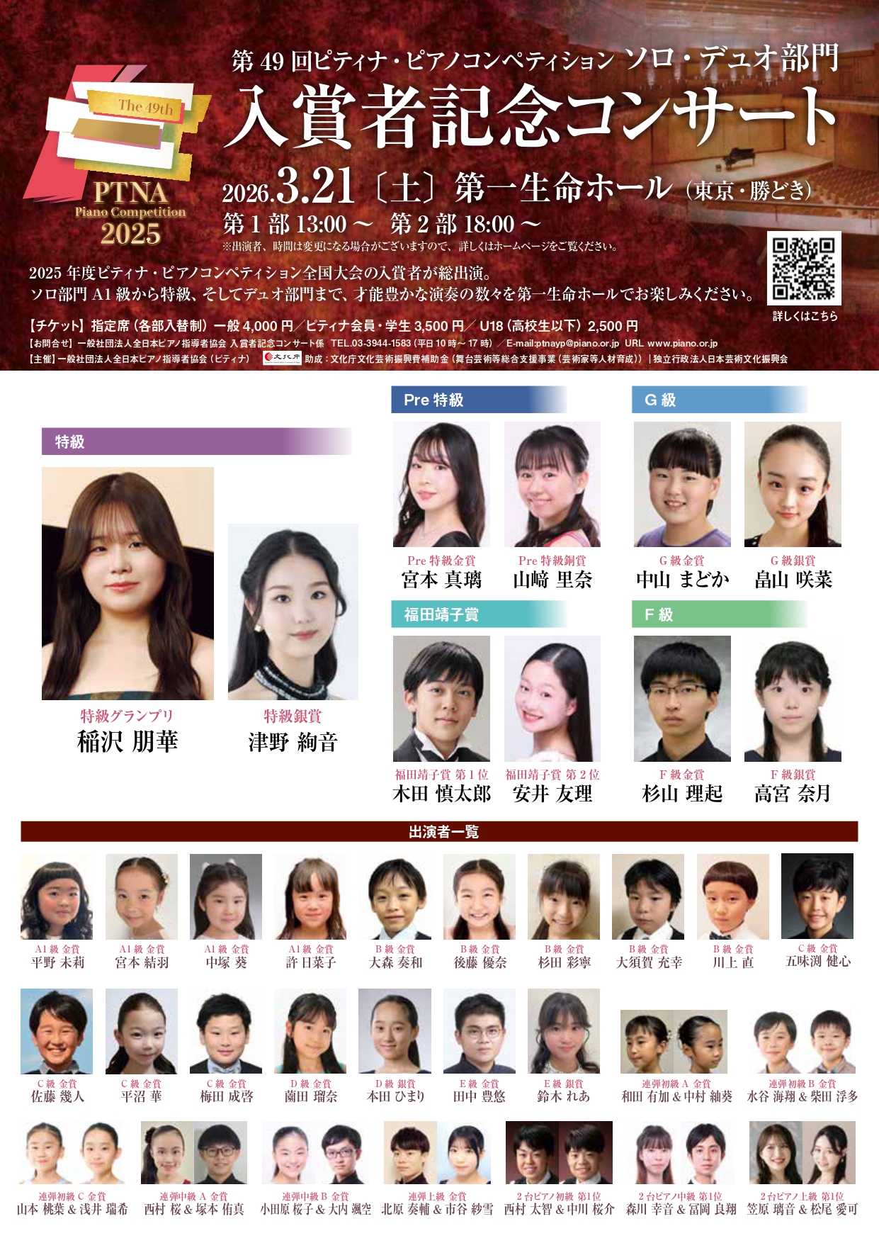 | 公演名 | 第49回ピティナ・ピアノコンペティション ソロ・デュオ部門 入賞者記念コンサート |