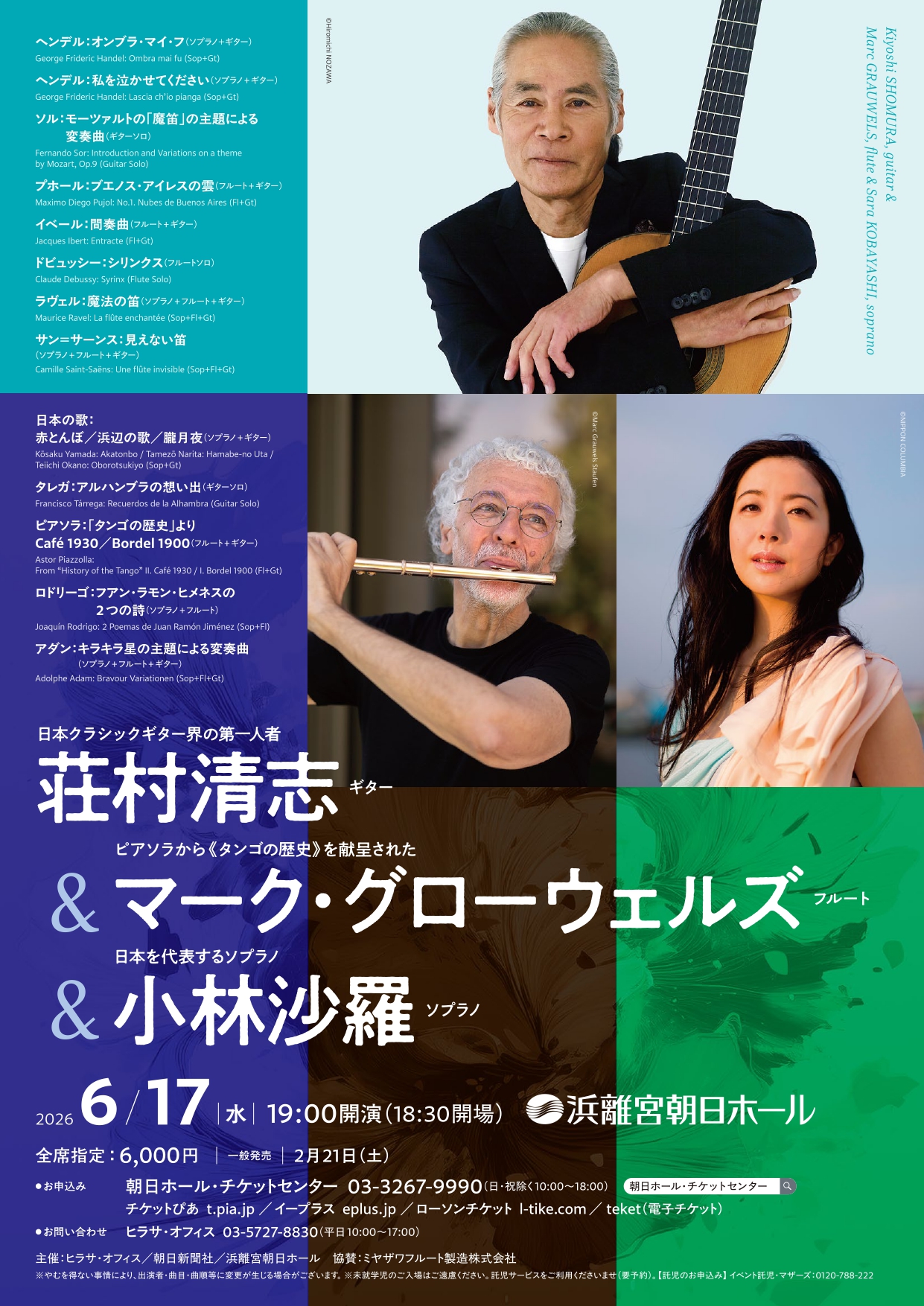 [ギター]荘村清志 [フルート]マーク・グローウェルズ [ソプラノ]小林沙羅 |