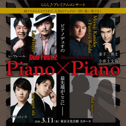 | 公演名 | ららら♪プレミアムコンサート Vol.1 石田泰尚 × 加羽沢美濃 | ~ヴァイオリンとピアノで奏でるクラシックの名曲と映画音楽~ |